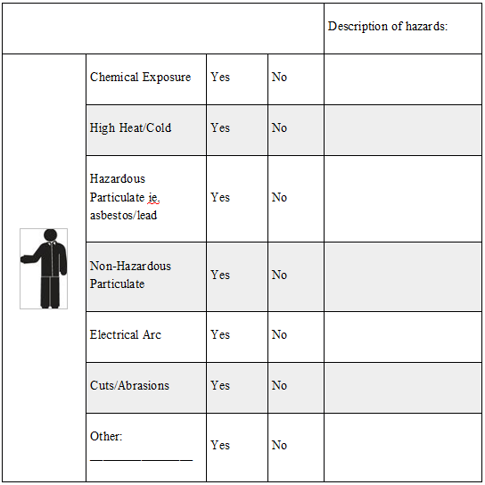 Print this Hazard Assessment Form and use it as a guide when conducting the walk-through survey. Observe the layout of the work area, operations being performed and any hazards present. This form aligns the body part that could potentially be exposed to a hazard and it is addressed by putting a check mark in either the yes or no box. The person who conducts the hazard assessment survey should identify which area or job classification was reviewed, when the assessment was conducted and finally, signs and dates the form when it’s completed.