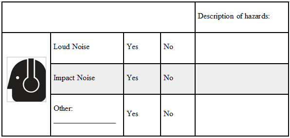 Tasks that can cause hearing hazards include, but are not limited to, working with or around loud machinery or tools in mechanical rooms, machining, grinding, sanding, pneumatic equipment, grounds equipment, generators, chillers, motors, saws, jackhammers or similar equipment.