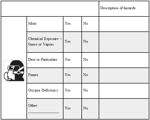Tasks that are associated with respiratory hazards include, but are not limited to, welding, grinding spray painting, working in confined spaces, chemical processing and potential exposure to asbestos, lead, silica or other particulate hazards. Exposures to these and other respiratory hazards can make you sick or can be deadly. These hazards come in the form of gases, vapors, dusts, mists, fumes, smoke, sprays and fog.